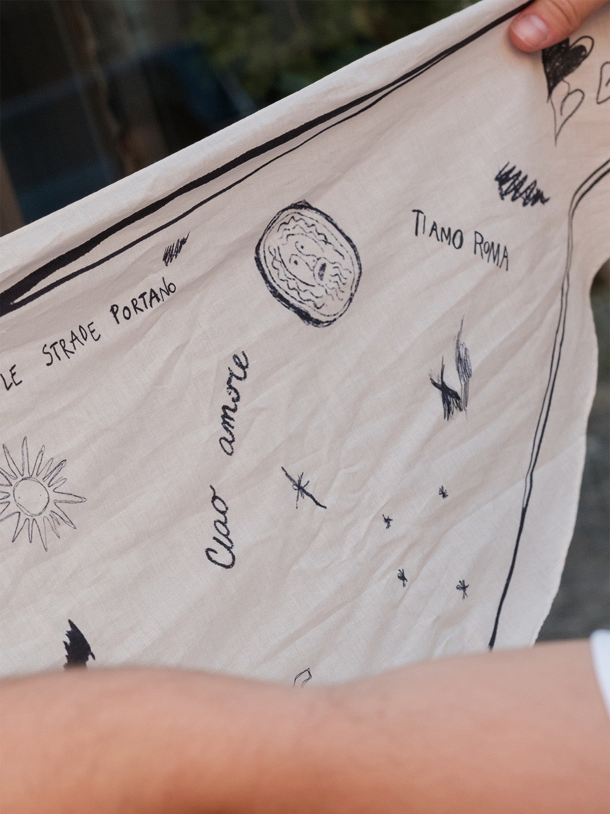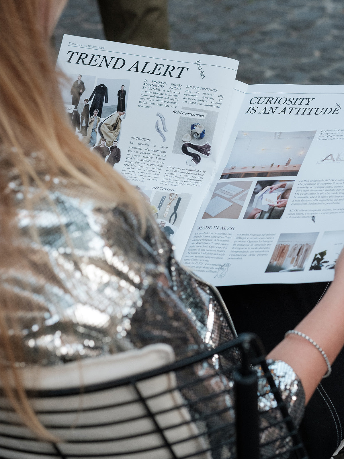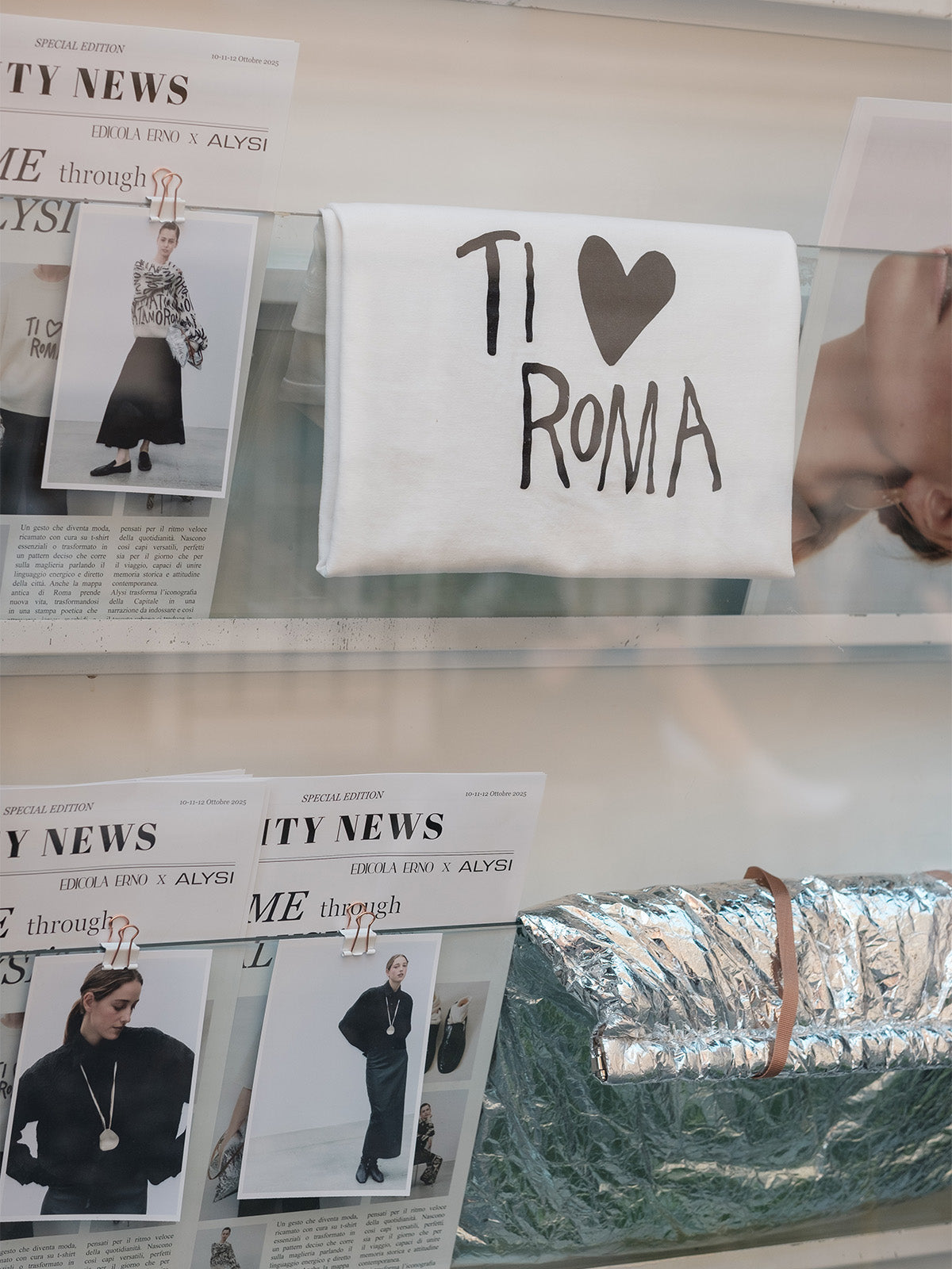 A font becomes an instinctive and deliberately imperfect manifesto , like the writings left on a wall during a night of love. Alysi transforms the iconography of the capital into a wearable narrative, and thus the urban fabric translates into style.
