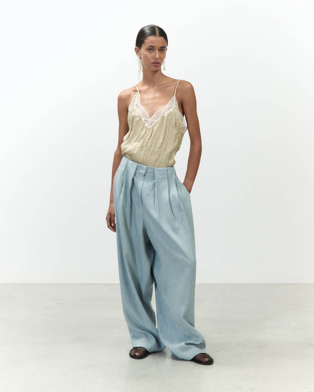 The model wears size 40, size S in knitwear and size 26 in denim.